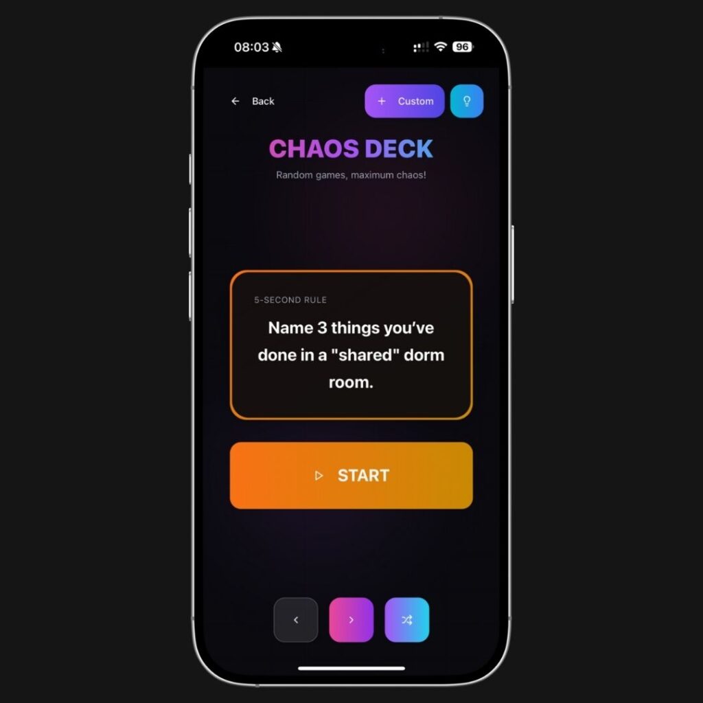 Think of it as the “God Mode” of party games. Instead of sticking to one vibe, the Chaos Deck reaches into our entire database and pulls out a randomized, high-speed mix of Never Have I Ever, Most Likely To, Fact or False, and the 5-Second Rule.